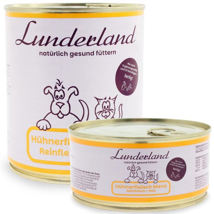 Alle Menü-Dosen sollten bei einer dauerhaften Fütterung um weitere Komponenten ergänzt werden. Mit einem Kalziumpräparat (z. B. Lunderland Knochenmehl, Lunderland Algenkalk oder Lunderland Bio-Eierschalenmehl) sowie wertvollen Ergänzungspulvern z. B. Bio-Seealgenmehl (nicht bei Schilddrüsen-Überfunktion), Bierhefe und Bio-Hagebuttenpulver. Und einem Öl (z. B. das Seelachs-Wildfischöl im Wechsel mit dem Bio-Hanföl) wird das Futter abgerundet.
