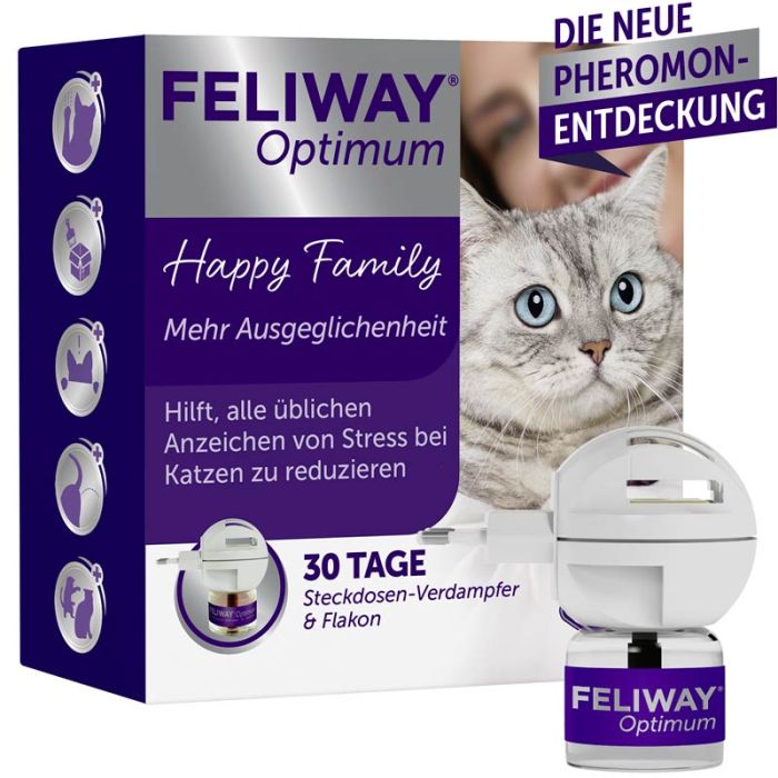Die fortschrittlichste Komposition von Katzen-Pheromonen-Bestandteilen, die vom Feliway Forschungsteam entwickelt wurde, enthält das Feliway Optimum. Diese neue Entdeckung soll Katzen dabei helfen, sich Zuhause geborgen und entspannt zu fühlen, ihnen Sicherheit zu schenken und Harmonie zwischen Deinen Katzen sicherzustellen, indem sie Wohlfühlbotschaften vermittelt.