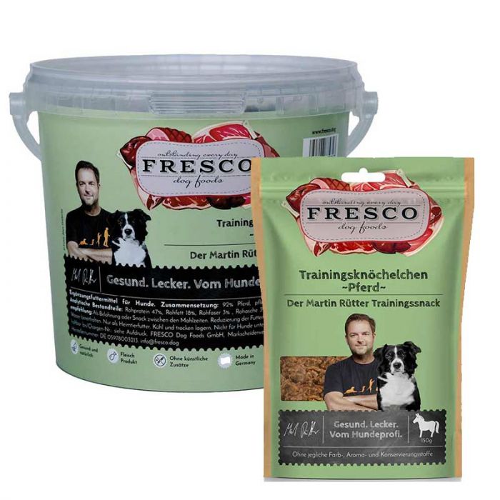 Seitdem sind wir von Fresco bei jeder Live-Show dabei und klären Dich dort darüber auf, wie einfach es sein kann, Deinen Hund ausgewogen und sinnvoll zu ernähren. Martin und vor allem seine Emma waren überaus angetan von unseren Trainingsknöchelchen aus getrocknetem B.A.R.F., die wir auf Martins Live-Shows an Dich verteilen. Und schnell ließ der Hundeprofi deshalb auch seine eigenen Ideen mit in die Überlegungen einfließen, wie der perfekte Trainingssnack aussehen und schmecken sollte. Direkt war uns klar: "Komm, wir machen das einfach!"