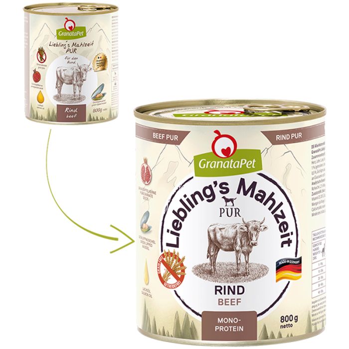 GranataPet Lieblings Mahlzeit Rind Pur ist eine klassische, herzhafte Mono-Protein Fleischdose ohne Getreide für wahre Fleischliebhaber. Sie wird ergänzt mit Granatapfelkernen, Lachsöl und Grünlippmuschel. Herstellung in Deutschland. Achtung die Zusammensetzung und das Design wurde leicht geändert.