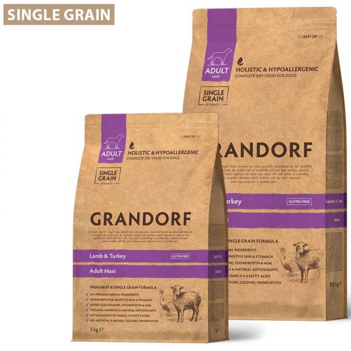 Das Grandorf Adult Maxi Lamm & Pute bietet eine hochwertige Ernährung für ausgewachsene Hunde großer Rassen. Diese Single Grain Rezeptur ist ideal für Hunde mit empfindlicher Verdauung oder einer Neigung zu Allergien. Dank des großen Granulats ist das Futter leicht zu schlucken und zu verdauen. Zusätzlich kann ein Chondroprotektor-Komplex die Gelenken und Bändern unterstützen – perfekt für große Hunde.