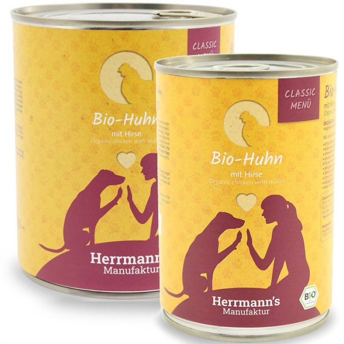 Die Sorte Bio-Huhn mit Hirse von Herrmanns ist mit leckerem Bio-Gemüse wie z.B. Kürbis und Zucchini. Ideal für Allergiker. Zutaten aus kontrolliert biologischem Anbau (DE-ÖKÖ-006).