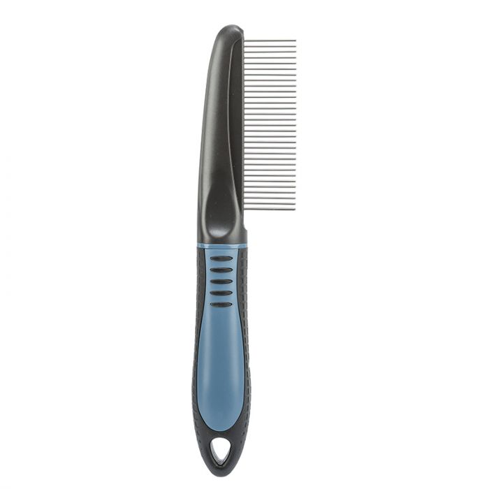 Dieser Kamm hat einen Kunststoffgriff mit rutschfester Gummieinlage und besitzt abgerundete Zinken zur schonenden Fellpflege. Er dient der besonderen Pflege des Deckhaars und der Unterwolle.