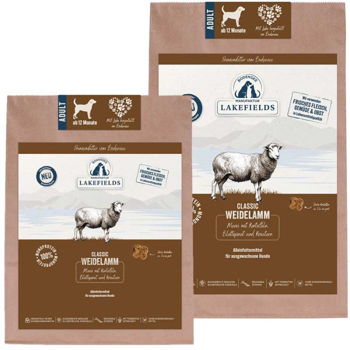 Das Trockenfutter-Menü Lamm von Lakefields enthält Fleisch und Innereien von regionalen Weidelämmern. In Kombination mit weiteren Zutaten wie Kartoffeln, Zucchini, Äpfel und Spinat wird die Mahlzeit schonend im Steinofen fertig gebacken. Optimierte Rezeptur!