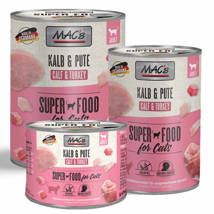 Macs Kalb & Pute bietet das was Ihre Katze am liebsten mag - Fleisch! Die getreidefreie Vollnahrung wurde konsequent ohne die Zugabe jeglicher Kohlenhydrate entwickelt. Die Kombination aus frischer Pute und frischem Kalb ist sehr schmackhaft. Durch die schonenede Zubereitung und die Zugabe von Vitaminen und Mineralstoffen wird eine naturnahe Ernährung Ihrer Katze erreicht.