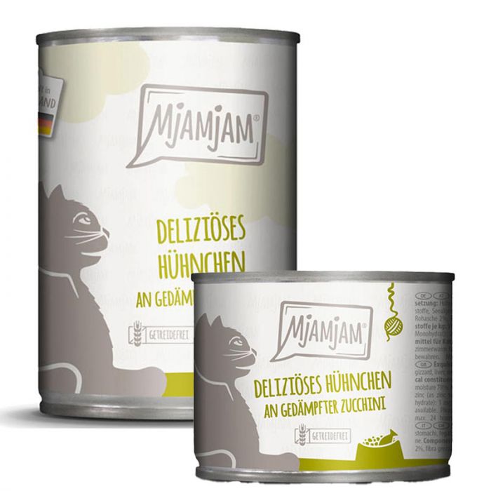 Lust auf was richtig Feines für deine Mieze? Dann solltest du die Sorte deliziöses Hühnchen an gedämpfter Zucchini von MjAMjAM kaufen. Diese Sorte enthält nur Hühnchen also Monoprotein und davon ganz viel.