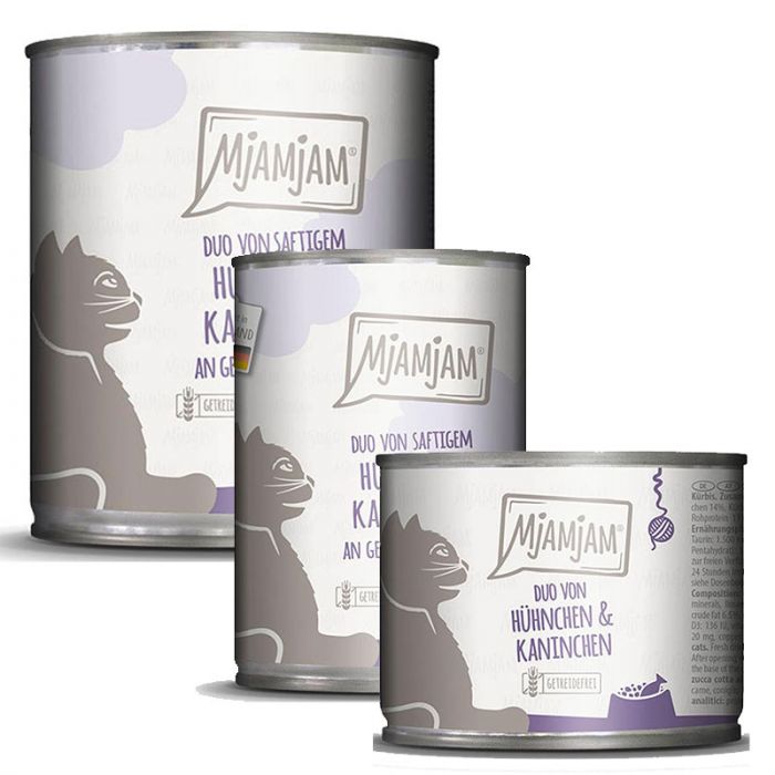 Die DUO Sorten bedeuten zweimal mehr Geschmack, zweimal mehr „Futter-Spaß“, zweimal mehr MjAMjAM – egal ob „Paula“ oder „Bruno“, alle lieben die MjAMjAM-DUOs! Wer den vollen Geschmack gleich doppelt erleben möchte, sollte schnellstens zu den leckeren DUO-Sorten greifen. Saftiges Hühnchen & Kaninchen an gedämpftem Kürbis sorgen zusammen für eine Mahlzeit ganz nach dem Geschmack Deines Lieblings. Dazu packt Mjamjam auch noch einen extra hohen Fleischanteil in die DUO-Sorten und verzichtet auf künstliche Zusätze. Klingt „pawtastisch“ oder? Dann ab in den Warenkorb damit! Deine Samtpfote wird sie lieben. Miau