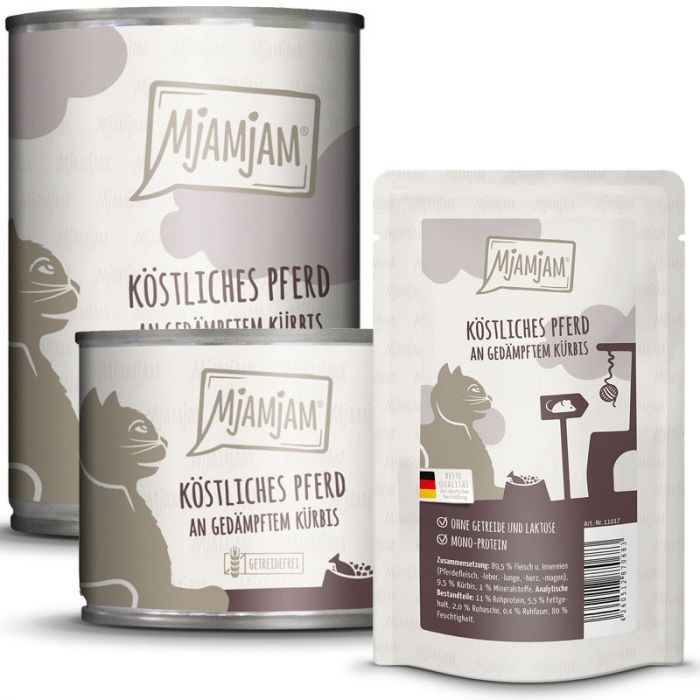 Das getreidefreie Nassfutter von Mjamjam bietet Ihrem Vierbeiner alles was er braucht und möchte: köstliches Pferdefleisch, serviert an gedämpftem Kürbis.