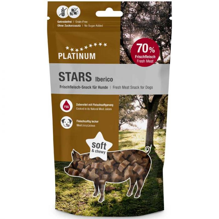Die Platinum Stars Iberico sind getreidefreie, kaubar-weiche Frischfleisch-Snacks aus hochwertigem Iberico-Schweinefleisch - ideal als leckere Belohnung oder Trainingssnack, auch für empfindliche Hunde. Durch die besondere Fleischsaftgarung sind sie besonders aromatisch, leicht verdaulich und natürlich ohne Zuckerzusatz.