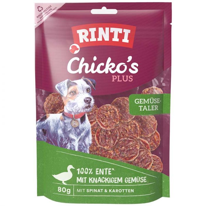 Rinti Chicko Plus Gemüsetaler werden ausschließlich aus frischem Entenbrustfilet sowie frischen Karotten und Spinat zubereitet und dazu schonend luftgetrocknet.