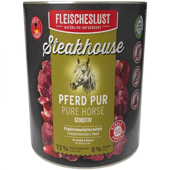 Die Sensitive Singlefleisch Sorte Pferd von Steakhouse ist Getreidefrei und ohne Schnickschnack. Somit ideal für ernährungssensible Fellnasen mit Unverträglichkeiten. Ergänzt mit frischem Obst und Gemüse, wertvollen Ölen wie auch Mineralstoffe und du hast das perfekte Menü zusammen.