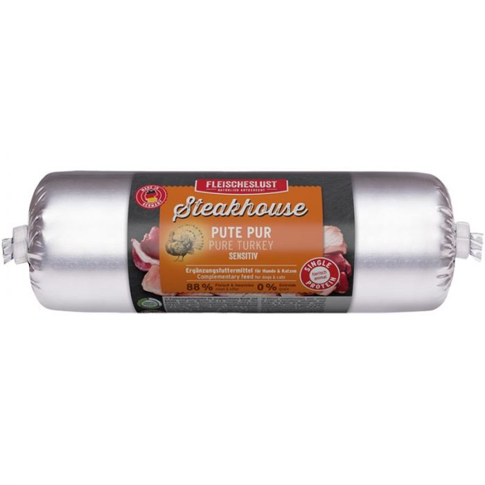 Die Wurst Pute pur von Steakhouse ist ein getreidefreies Hundefutter. Da es nur aus einer Fleischsorte besteht, ist es ideal für sensible oder allergische Hunde geeignet. Sie sind ideal zum Barfen geeignet und lässt sich gut kombinieren mit Flocken oder Gemüse.