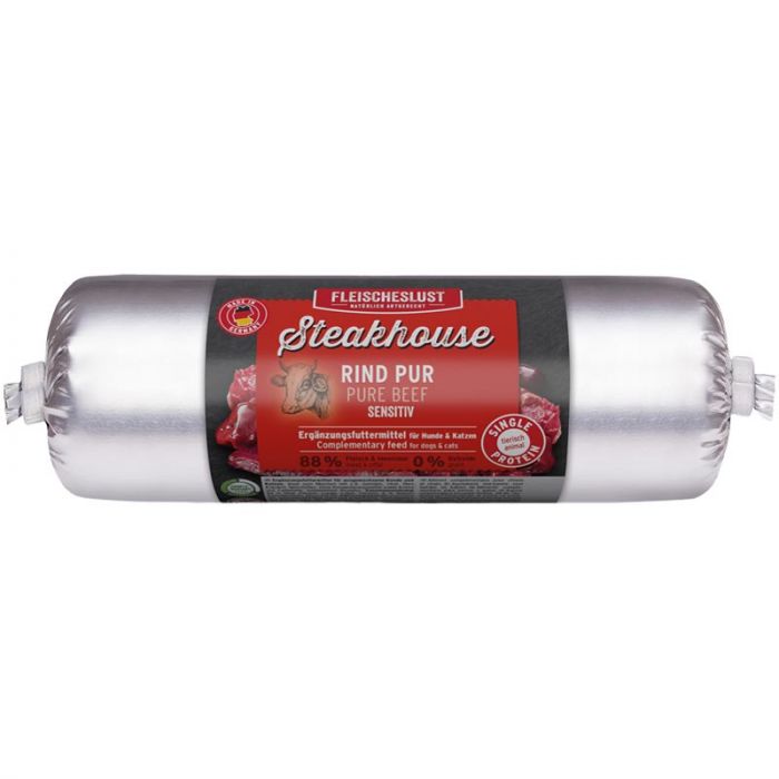 Deine Fellnase hat den Sonntagsbraten aus dem Ofen geklaut? Sie bekommt trotzdem das beste Futter: Mit unseren sensitiven Produkten von Steakhouse! Getreidefrei, ohne Schnickschnack, ideal für ernährungssensible Fellnasen mit Unverträglichkeiten - der bequeme Nass-Barf-Ersatz aus einer hochwertigen tierischen Proteinquelle. So isst halt ein Tier.